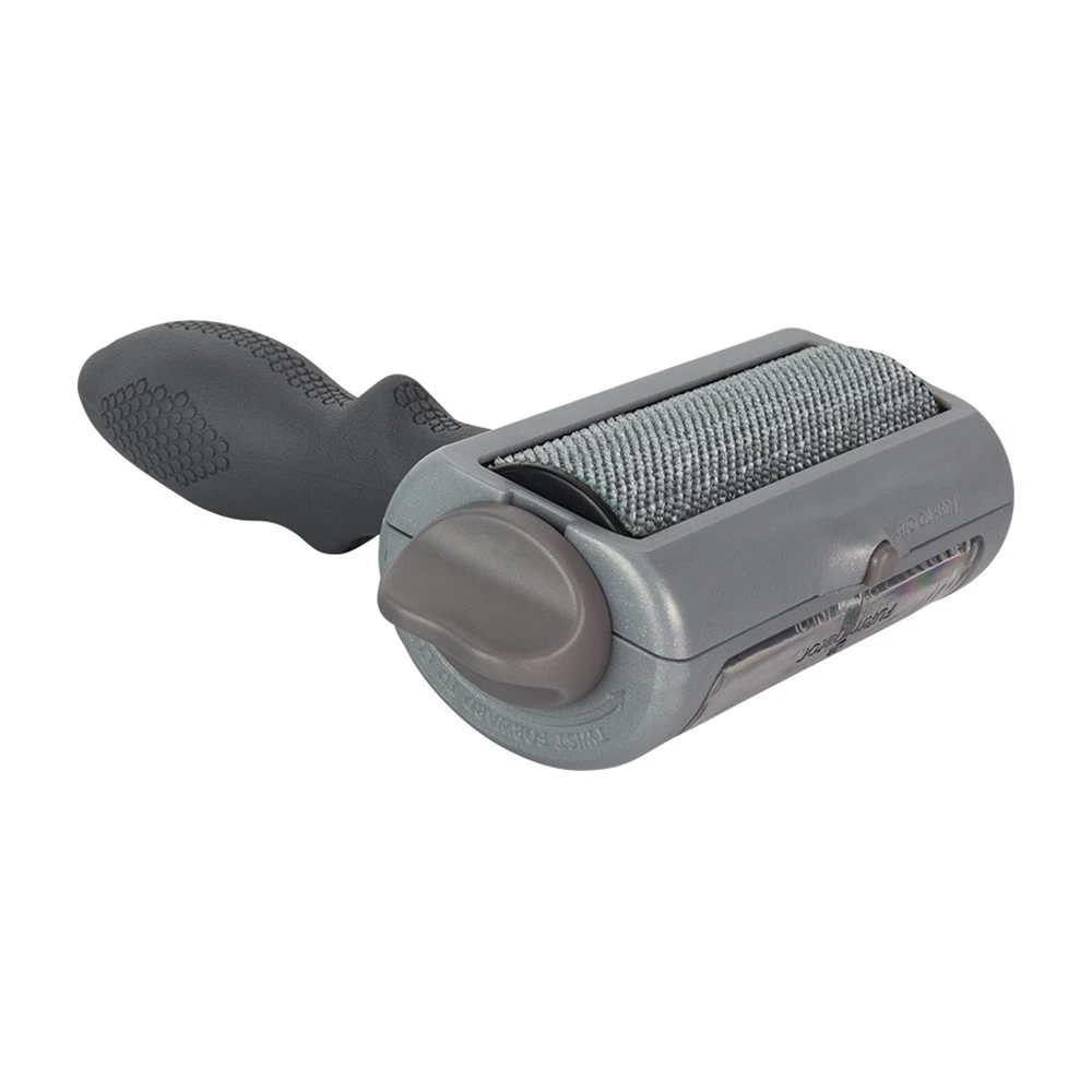- Stap 1 – Rol meerdere keren met de roller over oppervlakken die bedekt zijn met dierenharen. De tool neemt de hardnekkige haren op van kleding, meubels en stoffen zoals beddengoed, tapijten, autostoelen en nog veel meer. Draai regelmatig aan de knop om de haren te verzamelen in de opvangbak.