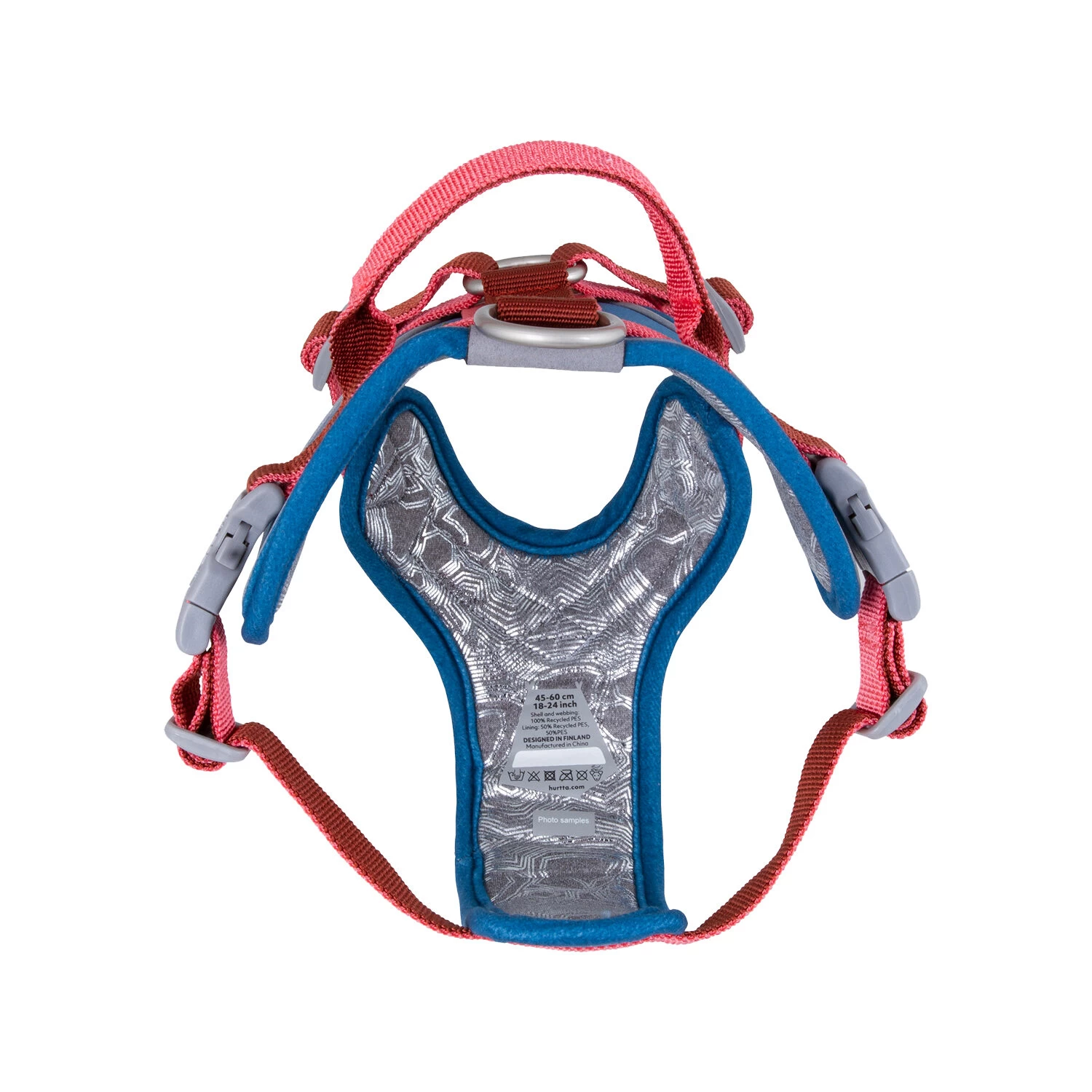 De voering van het harnas is gemaakt van 100% gerecycled polyester dat schuren en zweten helpt voorkomen. Het ruggedeelte is extra versterkt en bevat een handvat. Alle kwetsbare onderdelen van dit harnas zijn van extra stiksels voorzien en ook de metalen onderdelen zijn uitgebreid getest.