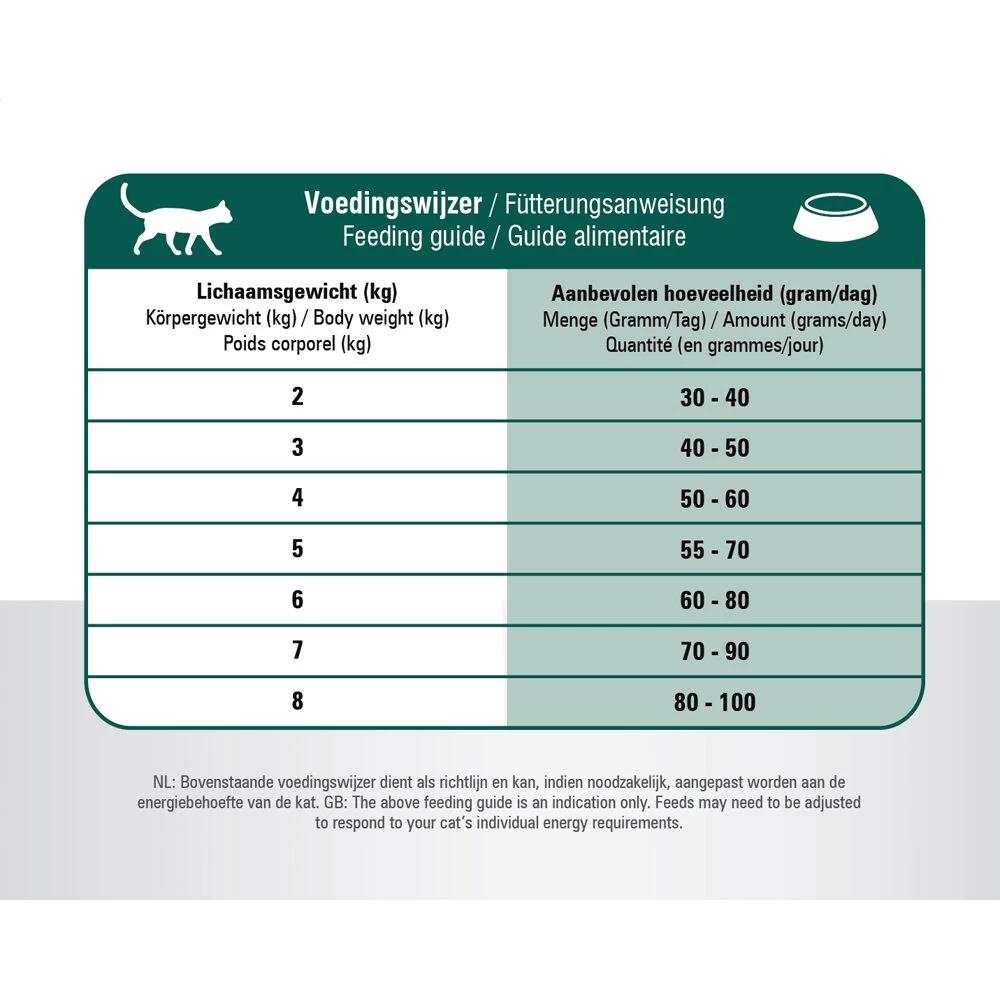 - Aangepaste mineraalsamenstelling, waaronder een verlaagd fosforgehalte voor de ondersteuning van de nieren