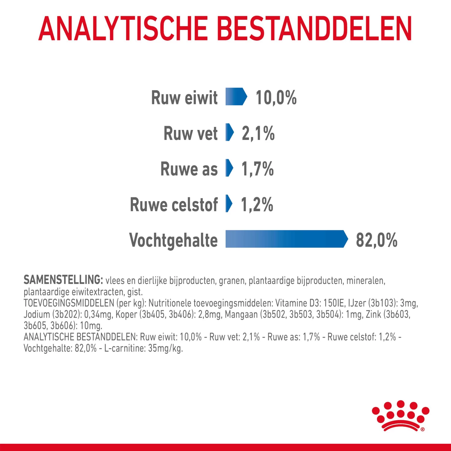 Katten die (iets) overgewicht hebben, kunnen problemen krijgen met hun gezondheid. Ze hebben dan een verhoogd risico op bijvoorbeeld suikerziekte, gewrichtsklachten, leverproblemen of slechtere doorbloeding. Om uw kat mooi op gewicht te houden is er de Light Weight Care in Gravy van Royal Canin. Dit natvoer van vleesbrokjes in saus bevat minder calorieën, waardoor u de calorie-inname van uw kat beperkt.