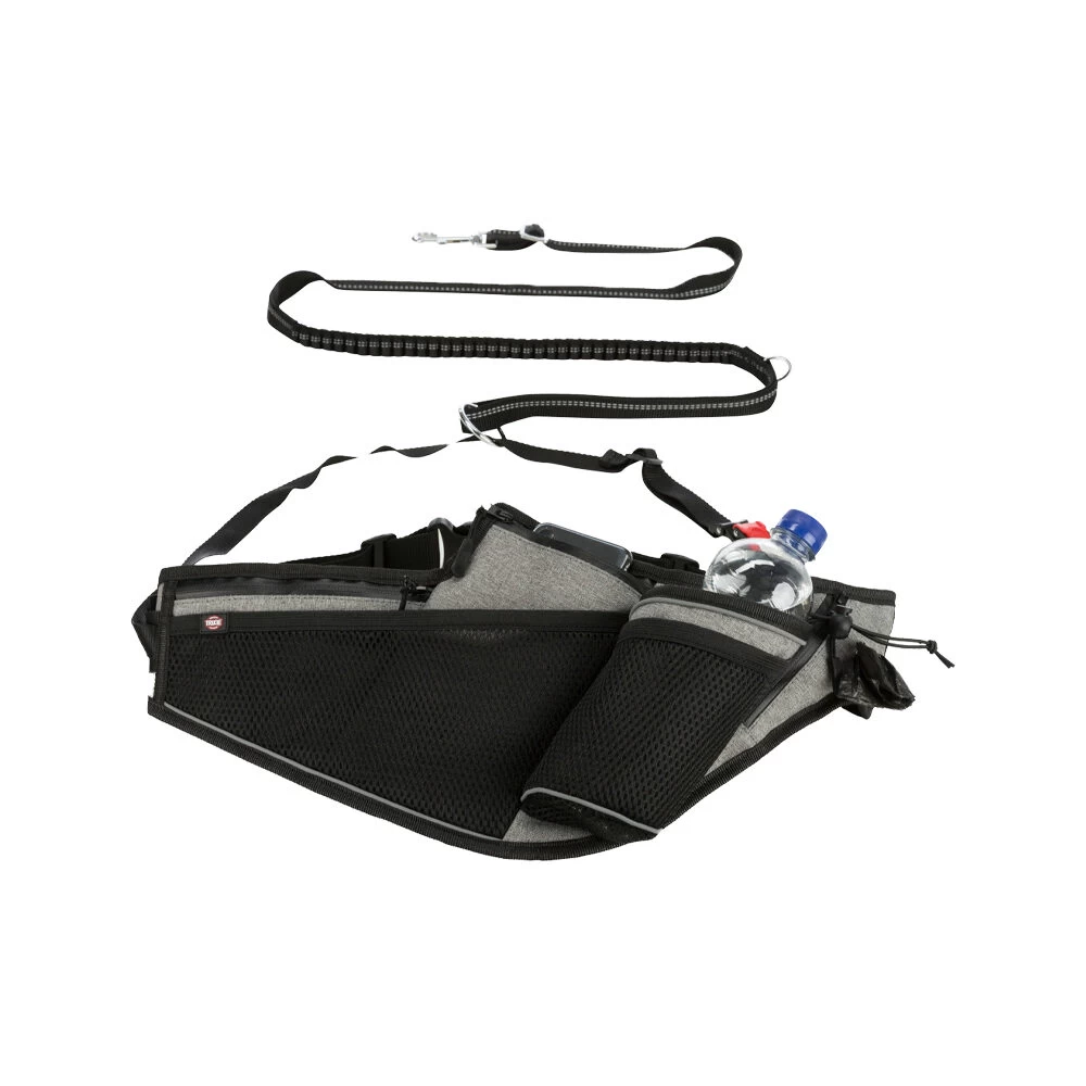 Omdat het veel leuker is om samen met uw viervoeter te joggen, walken of fietsen is er de Trixie Jogging Riem met Leiband. Deze ceintuur heeft een makkelijk aanlijn-systeem waardoor de impact van het trekken van de hond gelijkmatig over de taille van de loper wordt verdeeld. Ook wordt het plotseling trekken van de hond door een schokdemper opgevangen. De Joggingceintuur heeft een aangenaam draagcomfort door het ergonomisch ontwerp en een zacht inzetstuk gemaakt van mesh. De ceintuur beschikt over diverse vakken en een bekerhouder, waterdichte ritssluitingen en een geïntegreerde poepzakjes-dispenser.