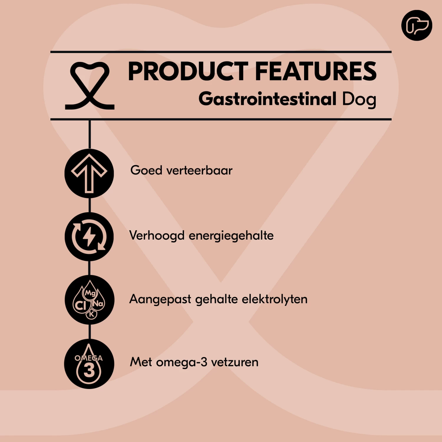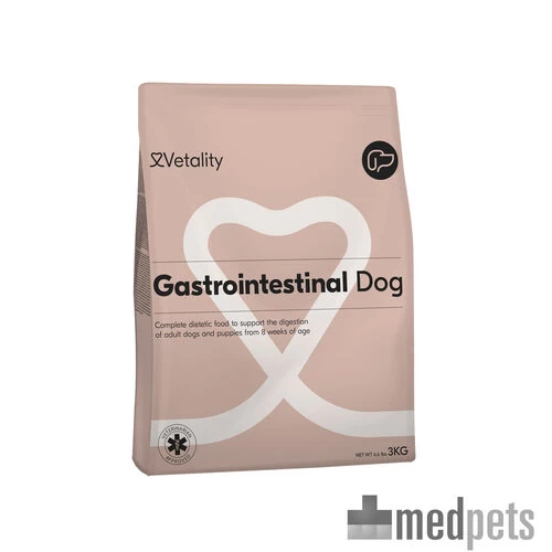 Wanneer er sprake is van gezondheidsklachten kan voeding een belangrijke rol spelen. Vetality Gastrointestinal is speciaal ontwikkeld door dierenartsen om honden met spijsverteringsstoornissen en/of maagdarmaandoeningen te ondersteunen. Deze voeding op basis van rijst en gevogelte is licht verteerbaar. Het draagt bij aan een gezonde darmflora en ondersteunt de spijsvertering. Daarnaast bevat de Vetality Gastrointestinal meer natrium en kalium om het verlies hiervan door de dunne ontlasting te compenseren. De voeding bevat omega 3-vetzuren welke helpen gezonde cellen en weefsels te beschermen en te behouden.