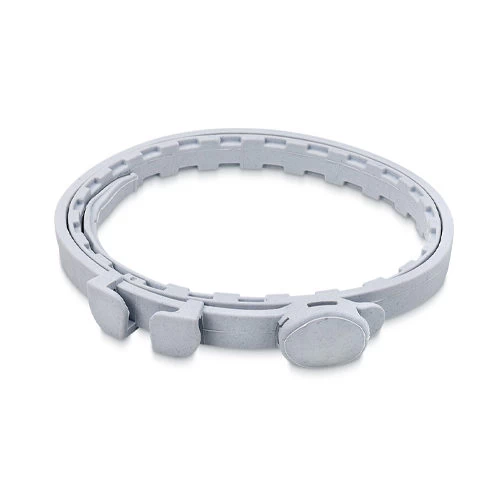 Verwijder de halsband uit de verpakking en verwijder de comfort strip. Bevestig de halsband niet te strak rond de hals van de hond. Twee vingers zouden tussen de halsband en de nek moeten passen. Haal het einde door de gesp en knip de rest van de band af op 5 cm van de gesp.